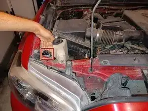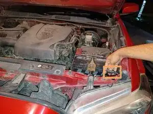 Чтобы найти левую лампу дальнего света, смотрите между внутренней частью левой фары и бачком омывателя лобового стекла.