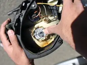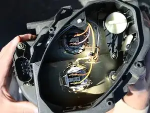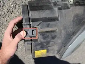 Совместите разъём фары с посадочным местом в кузове перед тем, как задвигать фару назад.