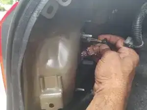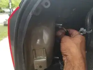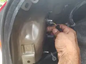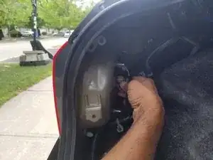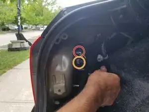 Отодвиньте ковролин, чтобы получить доступ к лампам, и найдите положение между лампой заднего указателя поворота и лампой стоп-сигнала.