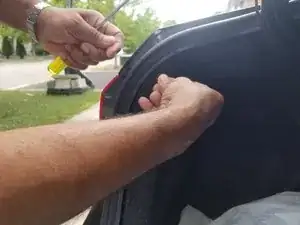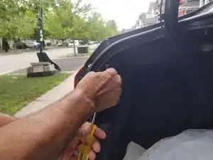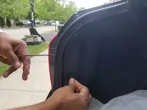 Откройте крышку багажника и снимите два чёрных пластиковых крепления с боковой стороны автомобиля, на которой перегорели лампы, при помощи плоской отвёртки.