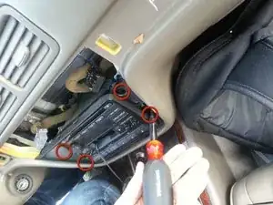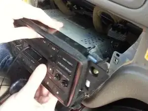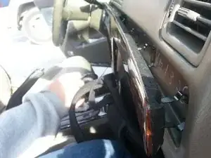 Используя инструмент для снятия панели или длинную отвертку с плоским лезвием, аккуратно сняйте отделку под дерево и освободите зажимы. Будьте осторожны с тонкими участками под магнитолой, чтобы не сломать отделку.