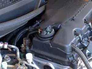 Снимите крышку заливной горловины масла с пассажирской стороны двигателя, повернув её против часовой стрелки, затем поднимите её, чтобы вынуть из горловины.