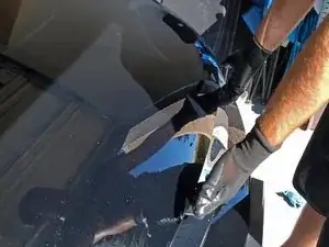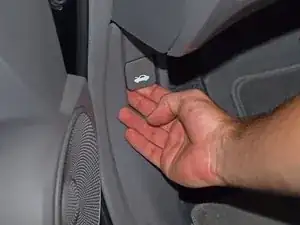 Установите домкрат в точку подъёма на передней пассажирской стороне на шве кузова — более толстая металлическая часть сразу за передним колесом.