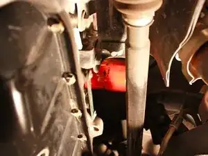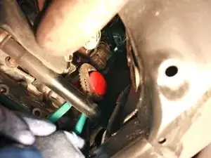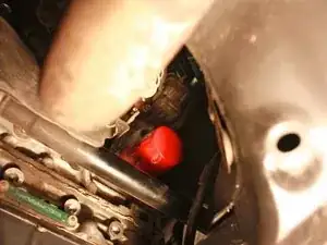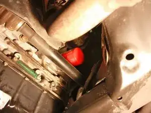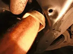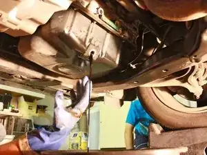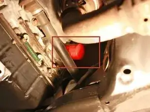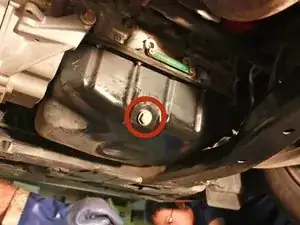 Залезьте под переднюю часть автомобиля лёжа на спине и найдите сливную пробку масла.