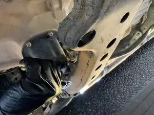 Придерживая защиту картера, снимите её с фиксаторов и удалите из-под автомобиля.