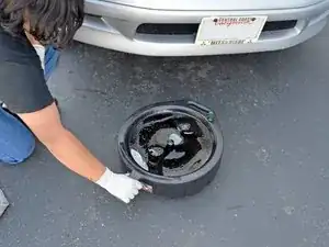 Медленно опустите домкрат, пока опора домкрата не начнёт нести на себе вес автомобиля. Снимите домкрат.