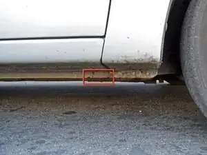 Начните с поиска точки поддомкрачивания. Она находится со стороны пассажира, под порогом и чуть позади переднего колеса.