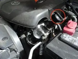 Найдите щуп уровня масла. Щуп расположен с левой стороны моторного отсека и обозначен желтым кольцом.