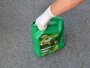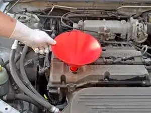 Залейте 4 кварта (около 3,8 литра) масла 10W-30 в двигатель. Одной рукой придерживайте воронку, чтобы избежать пролития.