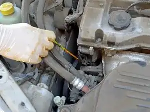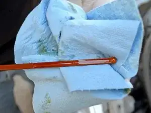 Вытяните масляный щуп, протрите его, полностью вставьте обратно в отверстие и снова извлеките.