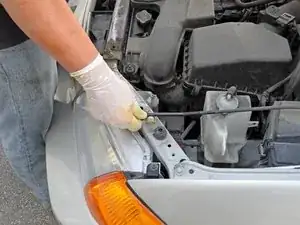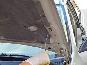 Одной рукой придерживайте капот, а другой вставьте упор-подпорку капота обратно в держатель.
