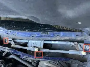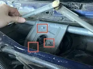 Отведите звенья сборки в сторону, чтобы открыть доступ ко всем трём болтам, крепящим мотор стеклоочистителя.