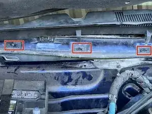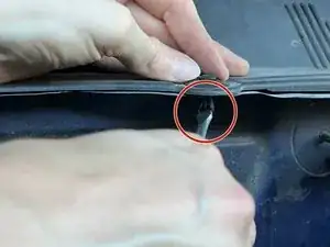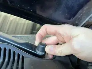Есть четыре защёлки, которые крепят жабо к кузову. Используйте плоскую отвёртку, чтобы поджать центральный штифт клипсы снизу и приподнять его.