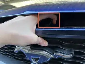 Трудно разглядеть, но можно нащупать прямо над эмблемой Mustang.