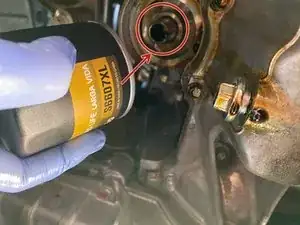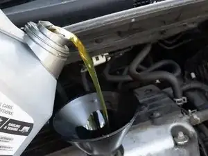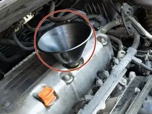 Установите воронку среднего размера и залейте новое синтетическое моторное масло 0W-20. Залейте 4,2 кварты масла.