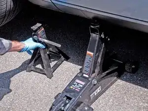 Осторожно опустите автомобиль на подставку, при необходимости подрегулируйте положение домкрата и автомобиля.