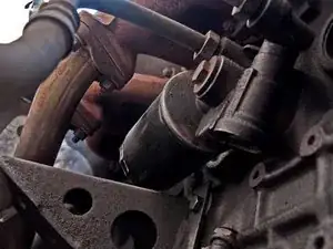 Найдите масляный фильтр. Он расположен под выпускными коллекторами.