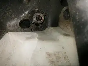 На фото — насос гидроусилителя руля. Он расположен в передней левой части моторного отсека. Видны свежие масляные пятна на кожухе вентилятора и других деталях.