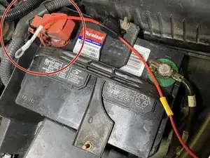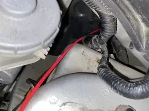Протяните провод питания (красный) и провод массы (зелёный) к аккумулятору: подключите красный к положительной клемме, зелёный — к чистому участку кузова автомобиля для массы.