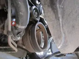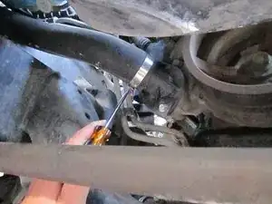 Найдите и ослабьте хомут на шланге охлаждающей жидкости с помощью отвертки с плоским лезвием. Шланг охлаждающей жидкости расположен ближе к нижней части поликлинового ремня под передней частью моторного отсека.