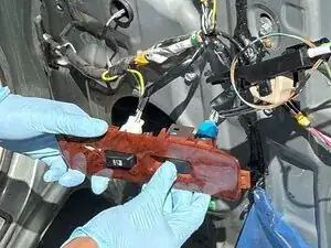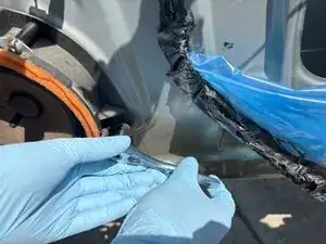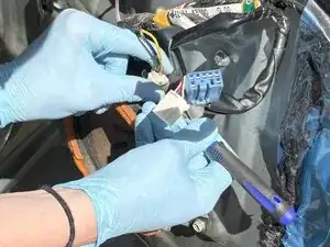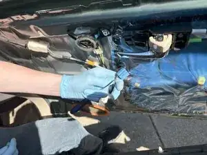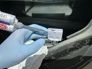 Повторите шаги 1–11 в обратном порядке, предварительно отключив аккумулятор перед контактом с проводами или разъёмами. Дайте клею затвердеть не менее 24 часов перед возобновлением нормальной эксплуатации.