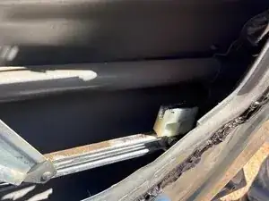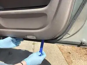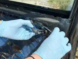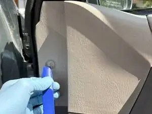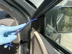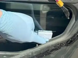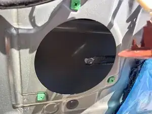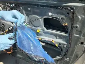 Используйте панель кнопок стеклоподъёмника, чтобы медленно опустить стекло до тех пор, пока не откроется доступ к креплениям регулятора в местах, где располагаются динамик и синяя плёнка.