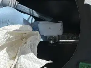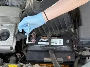Используйте ключ-головку на 10, чтобы подключить отрицательную клемму (чёрную) к аккумулятору.