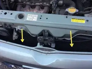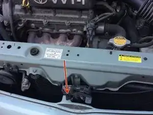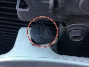 Освободите пластиковый фиксатор, соединяющий верхнюю часть бампера с серединой решётки радиатора.