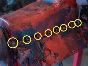 Три крышки с четырьмя болтами ⅝ и две крышки с двумя болтами ⅝ спереди и сзади коленчатого вала.
