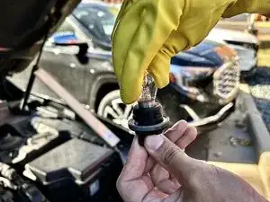 Надев латексные (или аналогичные) перчатки, возьмите новую лампу указателя поворота и совместите контактные штифты лампы с пазами в цоколе.