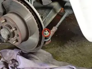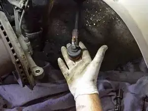 Снимите 15 мм гайку наконечника стабилизатора переднего поперечного стабилизатора с помощью трещотки или ударного пистолета.