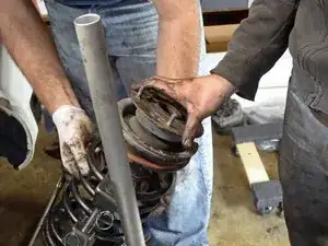 Снимите верхнюю опору пружины и снимите пружину со сборки стойки.