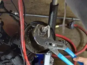 Снимите гайку штока стойки крупным разводным ключом или пассатижами с накатом.