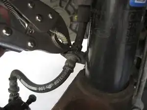 Снимите зажим, удерживающий тормозную трубку на стойке, с помощью губцевого зажима.