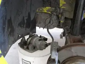 Положите суппорт на коробку или ведро так, чтобы тормозной шланг не растягивался и не перегибался.