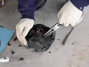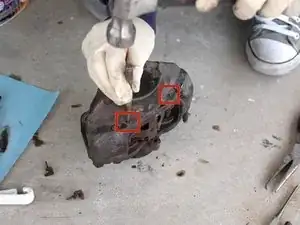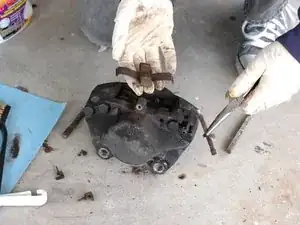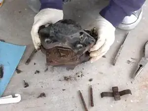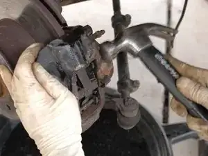 Далее используйте керн и молоток, чтобы выбить фиксирующие пружины держателя колодки из суппорта.