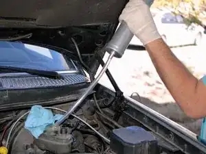 Отсосите несколько унций тормозной жидкости. Можно использовать показанный отсосной инструмент или чистую шприцевую грушеобразную трубку. Никогда не используйте этот инструмент для приготовления пищи позже!