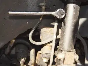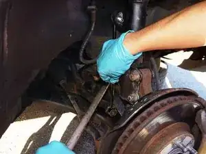 После снятия всех гаек используйте рычаг от гидравлического домкрата, чтобы опустить стабилизатор, что облегчит снятие тяги.