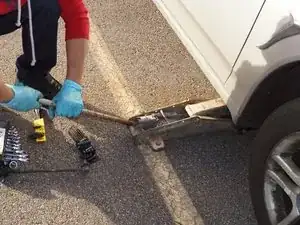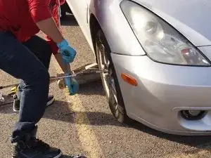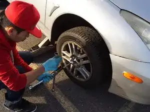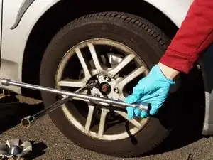 С помощью баллонного ключа вращайте гайки колес переднего пассажирского колеса против часовой стрелки, пока не сорвёте их затяжку.
