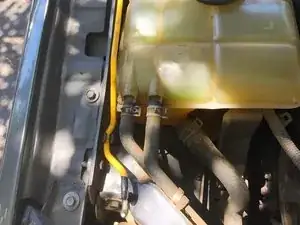 Открутите первый крепёжный болт, который прикрепляет металлическую скобу к опоре двигателя.