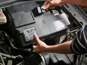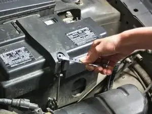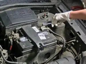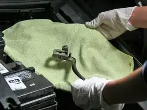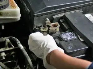 Снимите отрицательный провод (обычно чёрного цвета и обозначен знаком - или «Negative»), вращая гайку по часовой стрелке гаечным ключом.