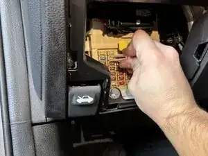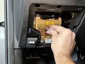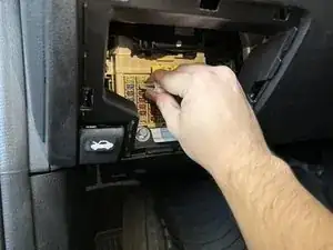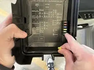 Поверните крышку блока предохранителей в прежнее положение, ручкой вниз, и вставьте верхнюю часть крышки на место.
