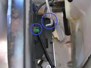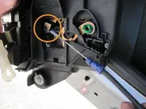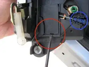 Посмотрев внутрь двери, вы увидите следующее. Вам нужно отсоединить кабель, который соединяет наружную ручку двери с корпусом. Это делается, нажимая на рычаг с белым пластиковым зажимом вниз.