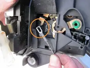 Также вам нужно отсоединить внутреннюю запирающую перекладину от зеленого зажима, к которому она прикреплена. Это можно сделать, вставив плоскую отвертку между ними и повернув ее вбок.
