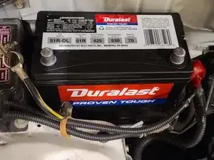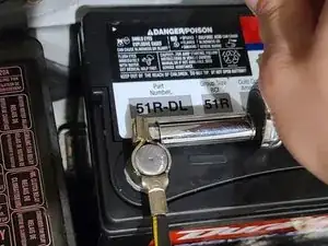 Подсоедините клеммы аккумулятора, начиная с чёрного отрицательного кабеля, затем красного положительного кабеля.