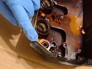 Схватите квадратный язычок пальцами и потяните вверх, чтобы снять прокладку крышки клапанов.