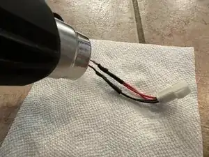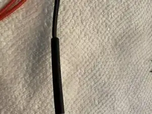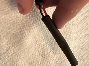 Наденьте маленькую термоусадочную трубку на оголенный провод и нагрейте её феном, чтобы она плотно обжалась вокруг проводов.