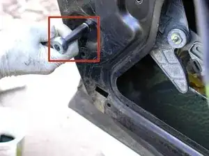 Ослабьте и снимите болт М10, который крепит последнюю точку крепления регулятора к каркасу двери.