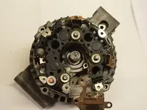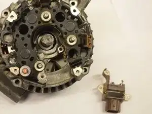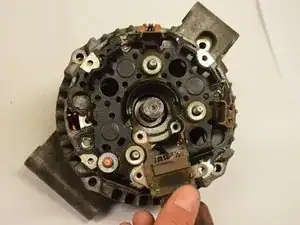 После этого вы должны увидеть внутренние компоненты генератора, в частности мостовой узел, в котором расположены выпрямитель, регулятор напряжения и щётки.