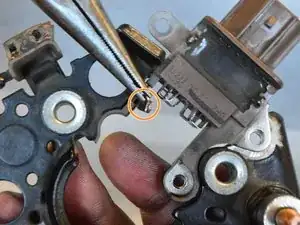 Используйте отвертку с крестообразным шлицем #2, чтобы отвинтить два винта 6 мм, удерживающих регулятор напряжения